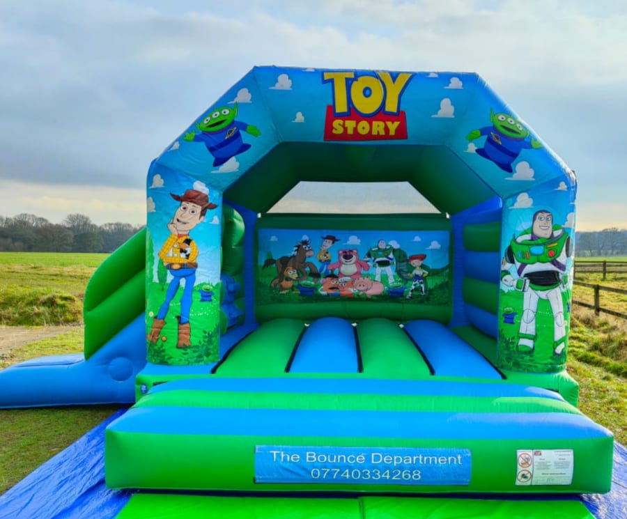 If you're looking for even more fun, the Toy Story Castle with Slide is the perfect choice. This larger inflatable measures 17.5ft x 15.5ft x 11ft (LxWxH) and includes a thrilling slide for added excitement. Kids will love climbing up and sliding down, creating unforgettable memories.