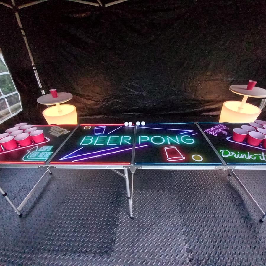 Our Beer Pong Table is not only sturdy, easy to set up, and affordable at just £55 for the day, it's also incredibly cool with its glow-in-the-dark design. The table comes equipped with LED lights that make it the perfect addition to any late-night party or event.