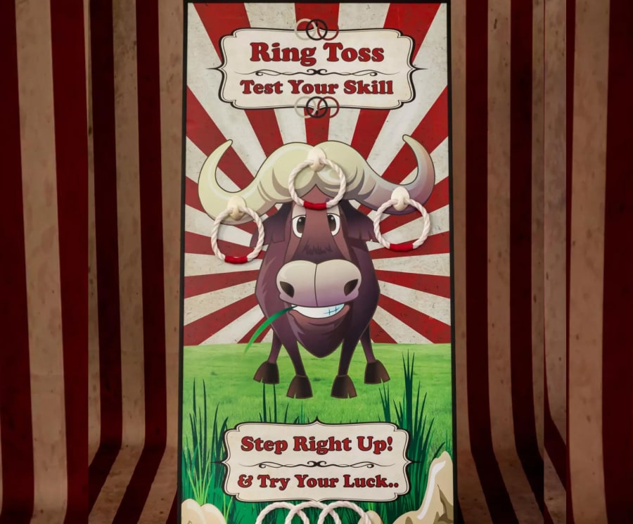 Eye-Catching Artwork: Our Ring Toss game boasts vibrant and inviting visuals, creating an enticing setup that draws participants in for a chance to aim and land their quoits on the horns with precision.