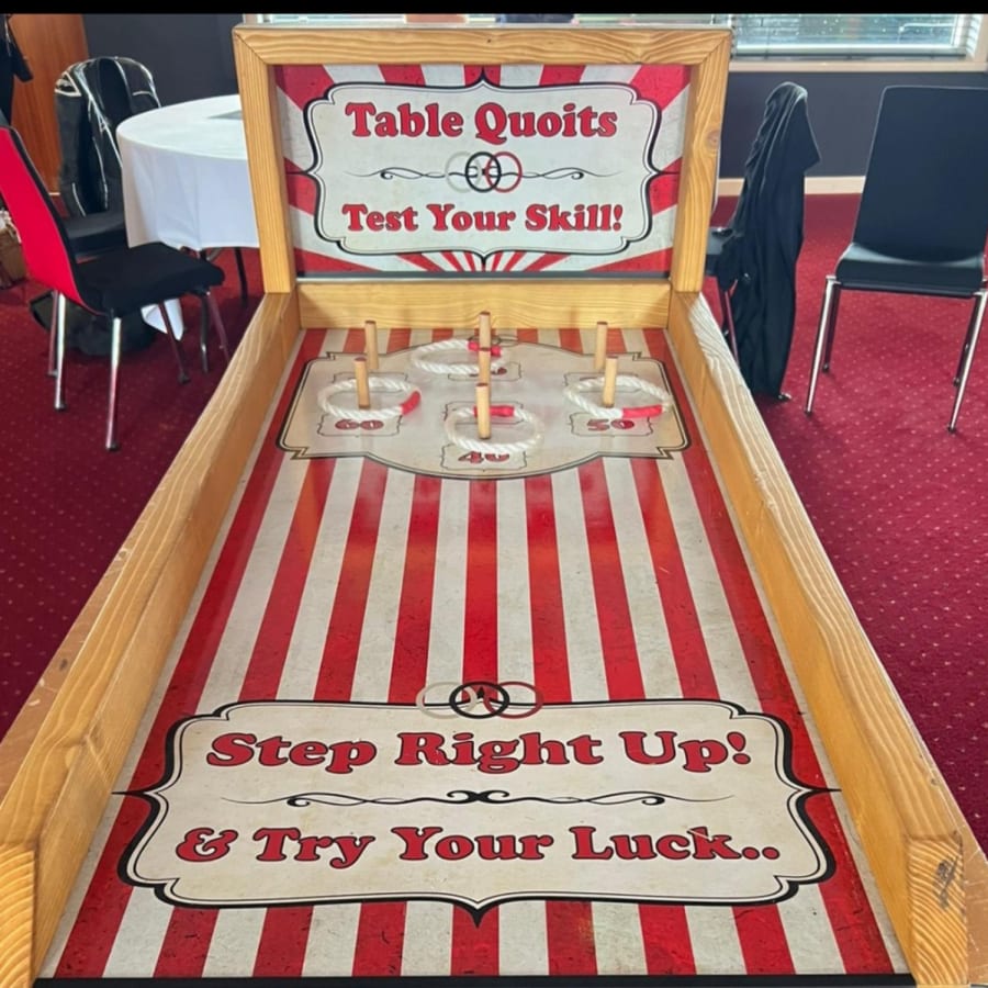 Elevate your event's entertainment with our Table Quoits game. Contact us today to bring the classic ring toss fun to your tabletop! 🌟🎯🔘